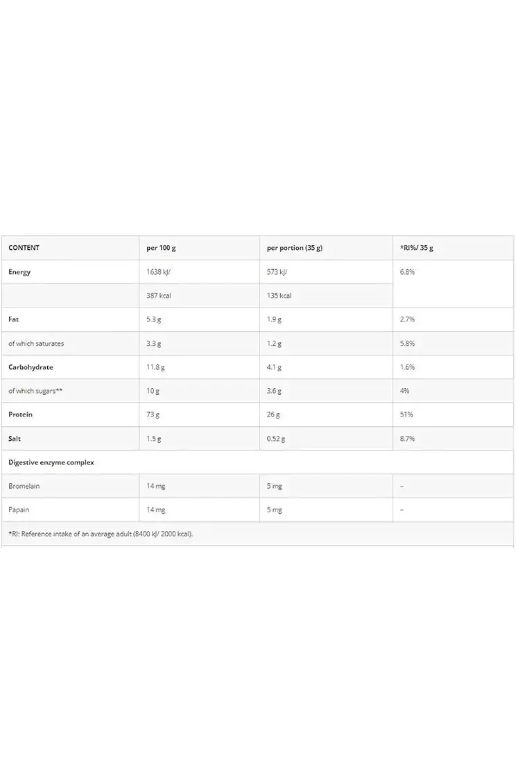 -73% of CFM whey protein contributes to growth and maintenance of muscle mass and maintenance of normal bones with digestive enzymes for you stomach comfort with sweetener.
